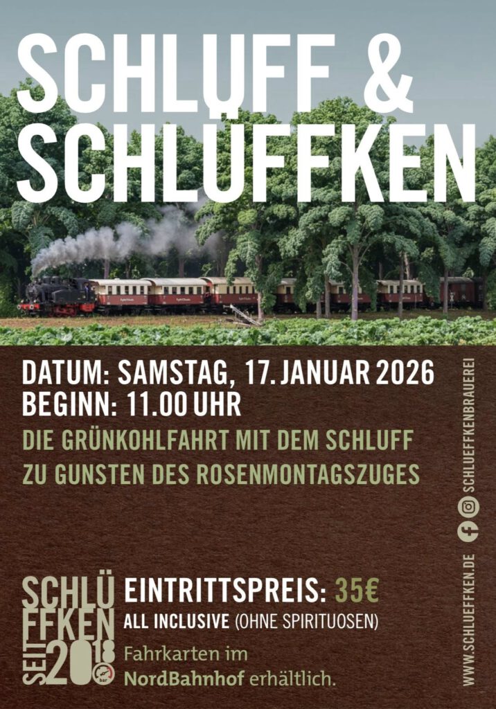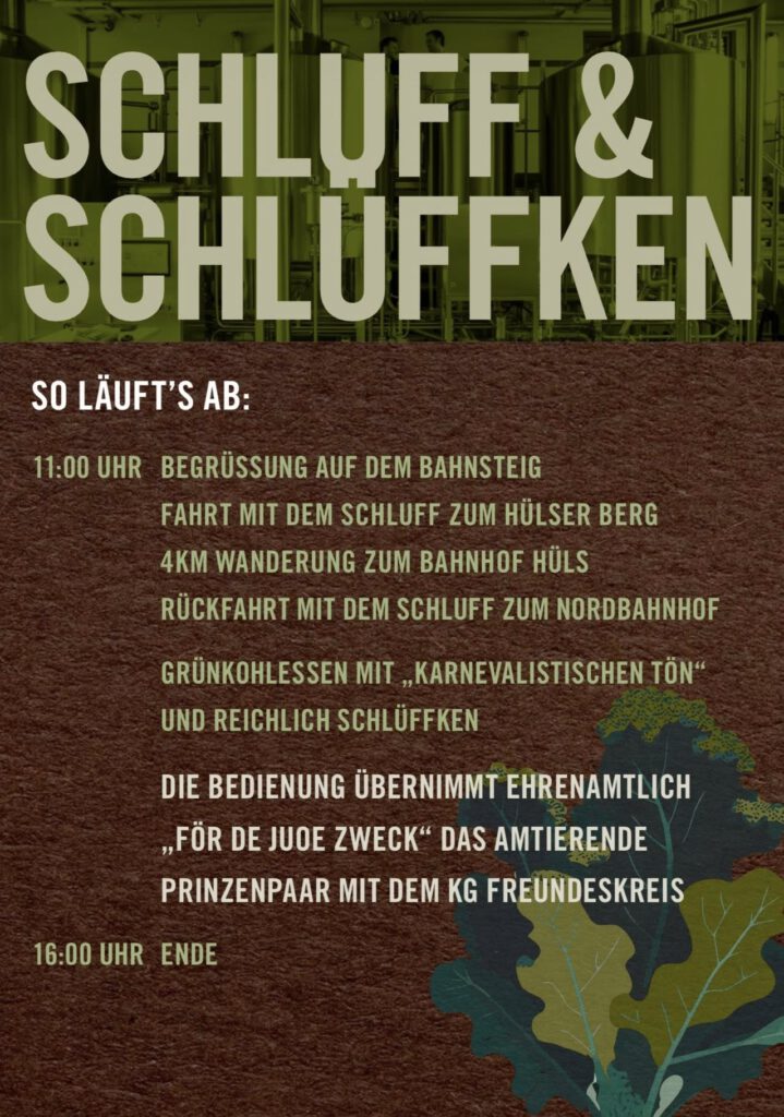 Am 17. Januar 2026 um 11 Uhr geht’s los: Mit dem Schluff gemütlich durch Krefeld tuckern, Grünkohl schlemmen und dabei sogar noch etwas Gutes tun. Die komplette Aktion wird von Familie Furth zugunsten unseres Rosenmontagszuges ermöglicht.